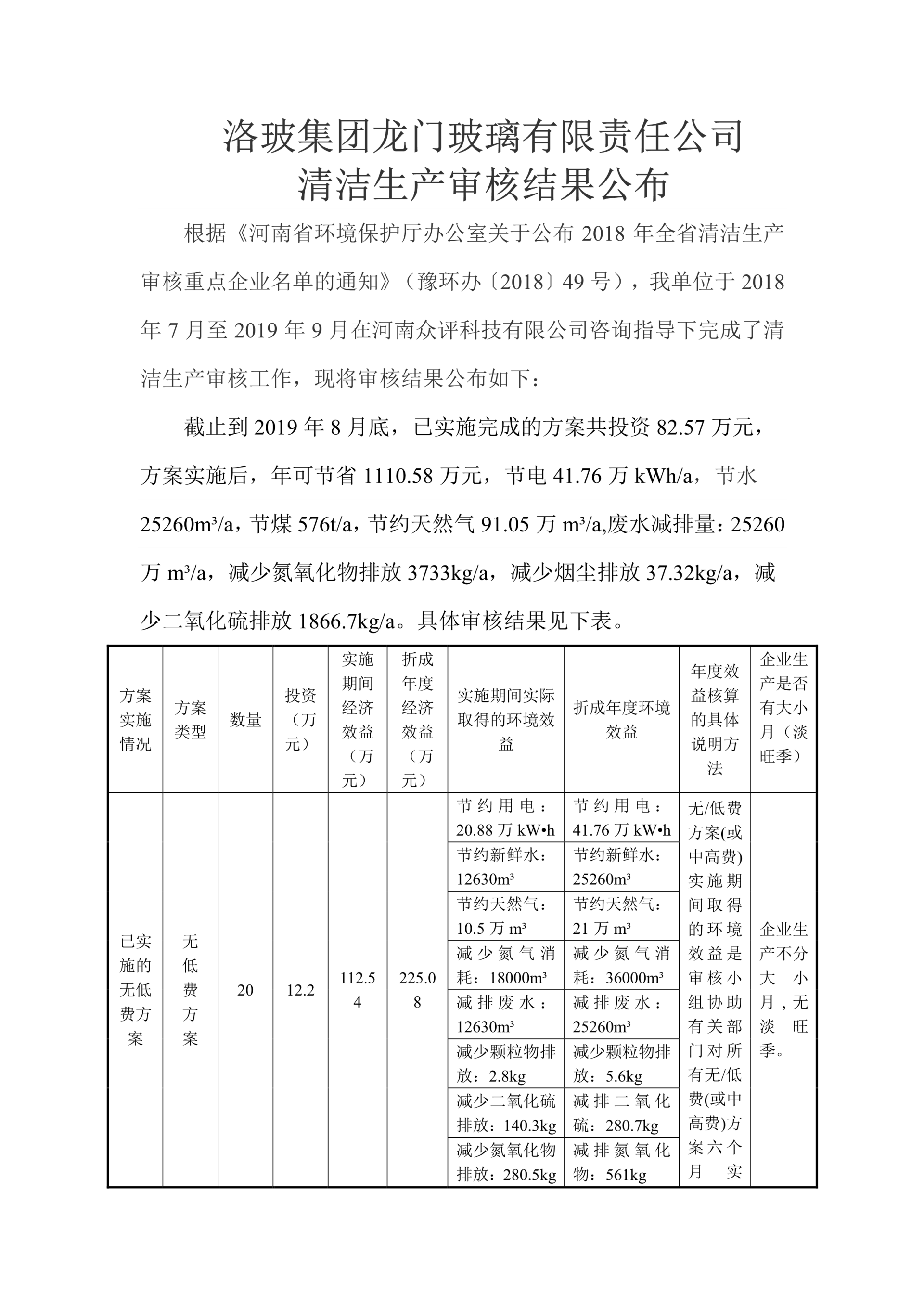 Luobo Group Longmen Glass Co., Ltd. announces the results of the clean production audit