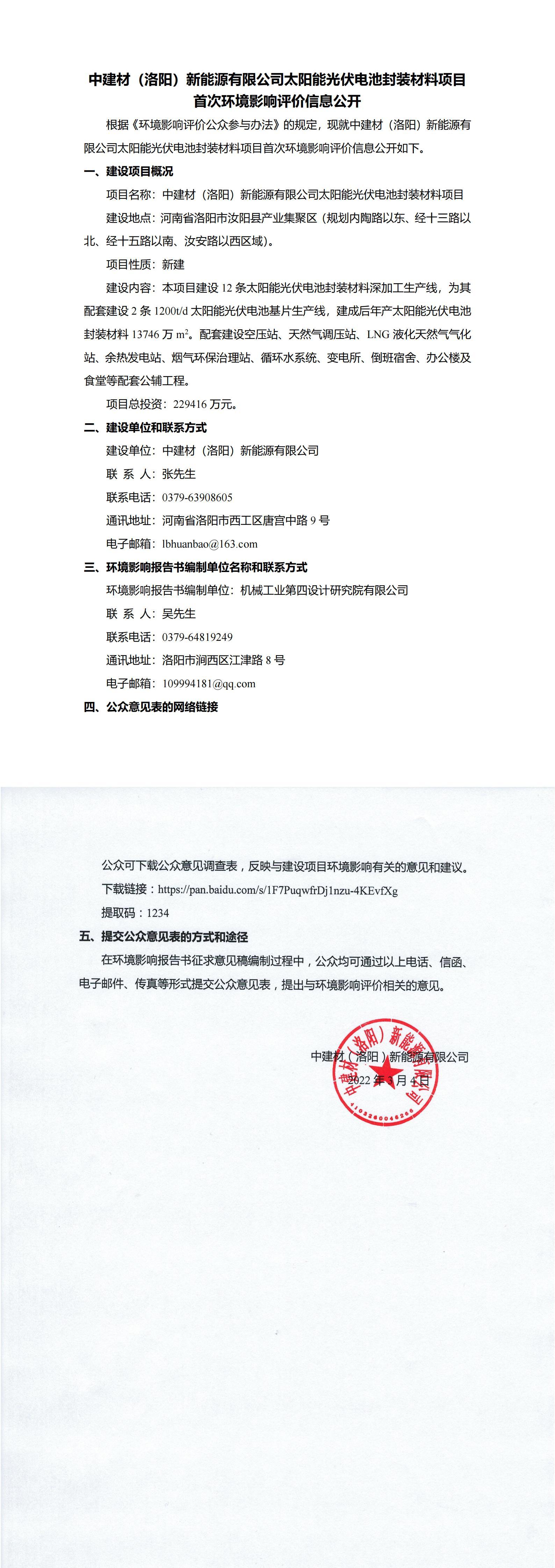 中建材(洛陽(yáng))新能源有限公司太陽(yáng)能光伏電池封裝材料項(xiàng)目首次環(huán)境影響評(píng)價(jià)信息公開