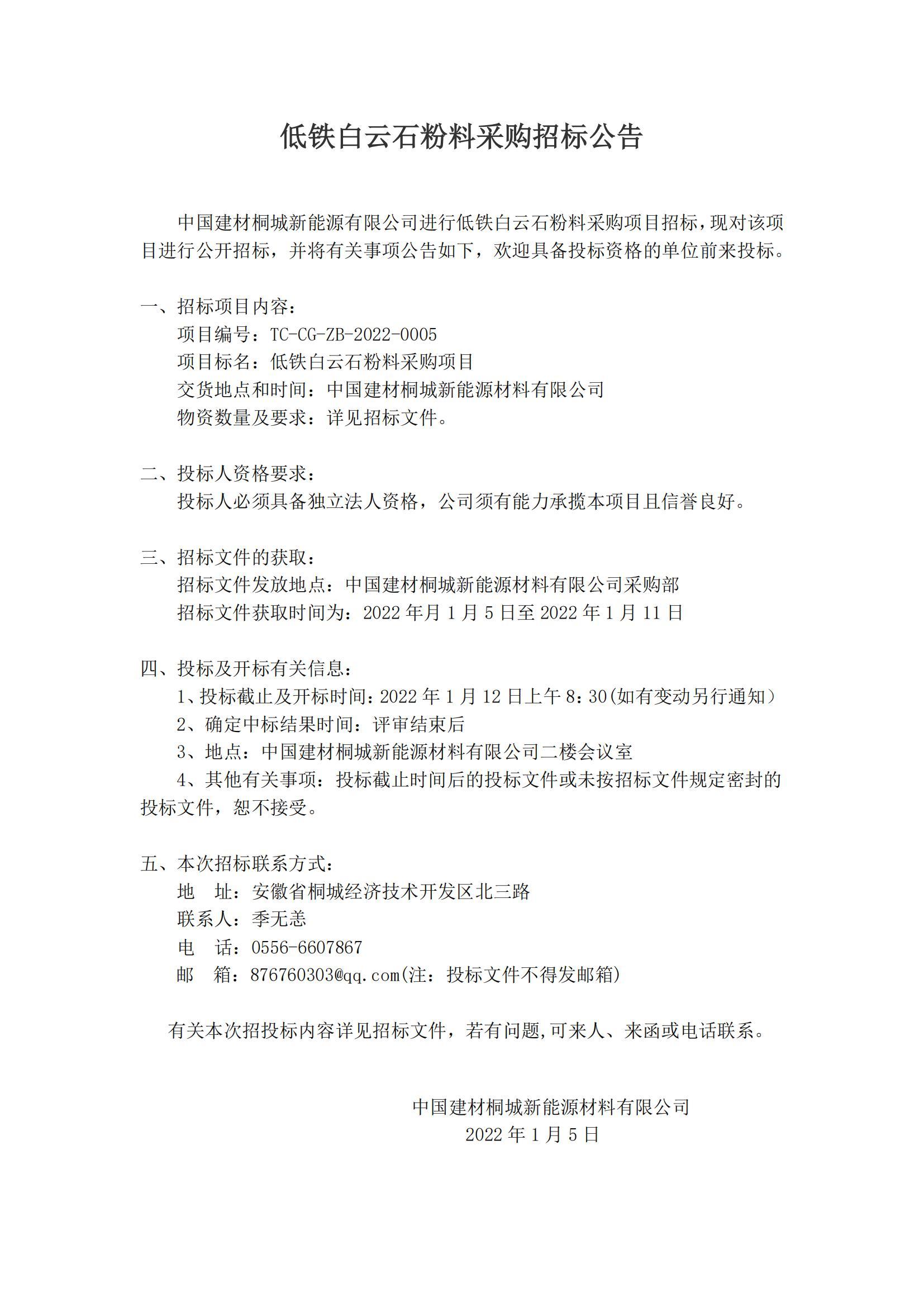 中國(guó)建材桐城新能源有限公司進(jìn)行低鐵白云石粉料采購(gòu)項(xiàng)目招標(biāo)公告